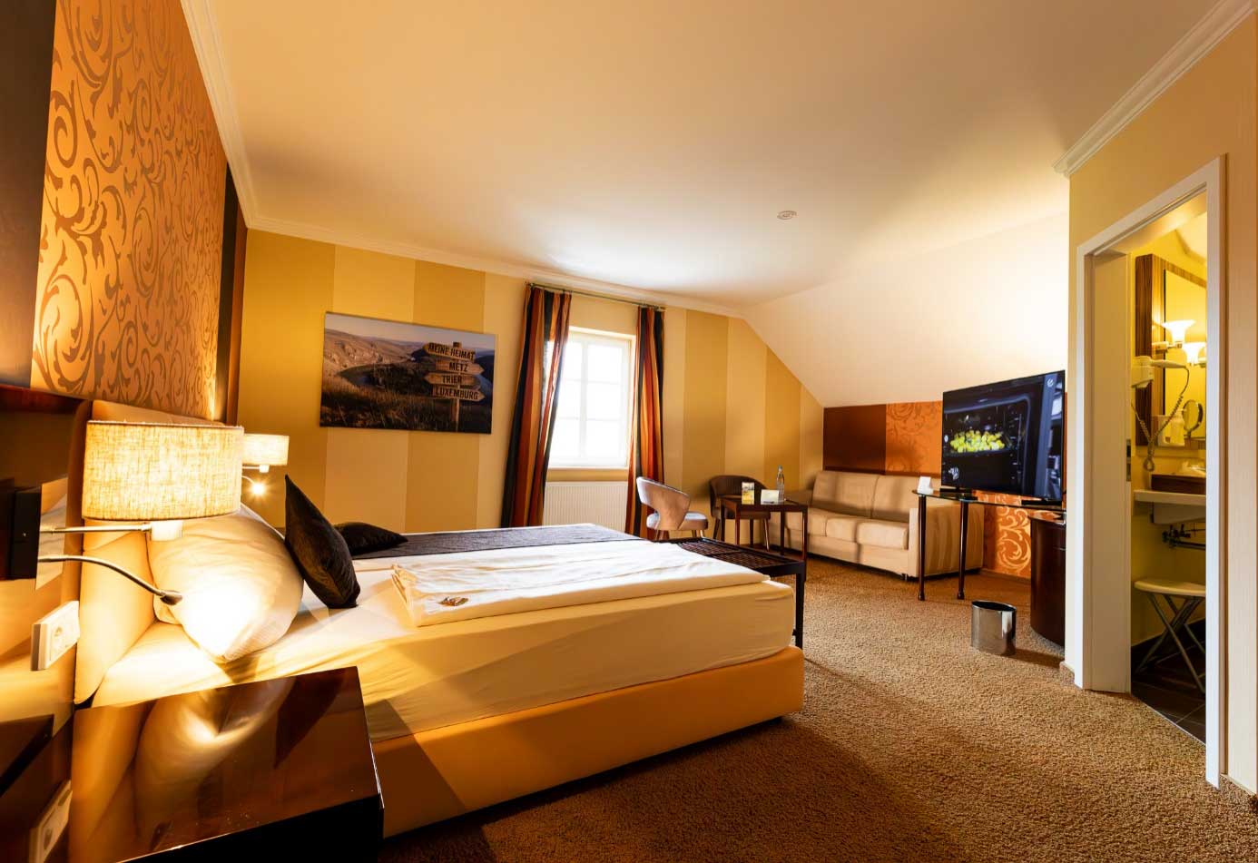 Im Hotel Sonnenhof Perl erwartet Sie ein harmonisches Zusammenspiel von Komfort und Gastfreundschaft. Unsere stilvollen Zimmer sind perfekt auf Ihre Bedürfnisse abgestimmt – von bequemen Betten über moderne Ausstattung bis hin zu ruhiger Atmosphäre für erholsame Nächte. Geschäftsreisende schätzen besonders unsere Lage nahe Luxemburg, während Urlauber die idyllische Umgebung und die Weinberge der Mosel genießen.
